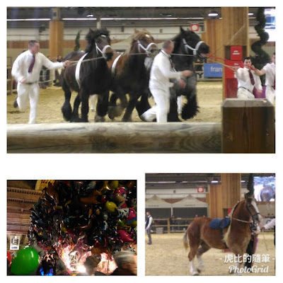 ,可以看到有如穿喇叭褲的馬種(下圖上,三隻馬需要好幾位壯丁一起拉才有辦法讓牠們勉強配合),還有短腿的馬種(下圖右下),有的還會拉著車狂奔,小孩子們看到都不想離開;不過這館絕對是最有味的一個館,如果不是和小孩一家一起,我可能在門口聞到那個味道就立馬溜之大吉了