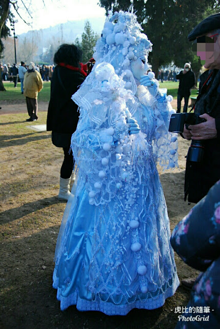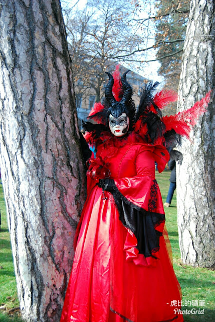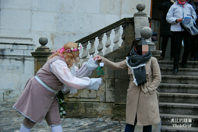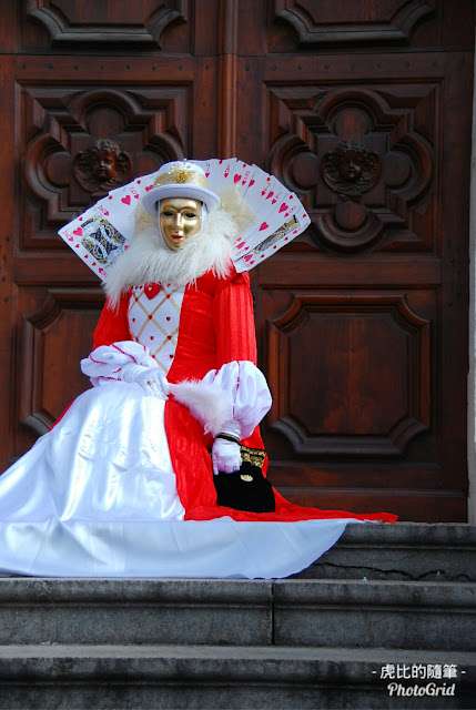 又扯遠了,回來,這個嘉年華最特別的在於,他們沒有遊行,就是已經變裝的人們,在小鎮裡還有湖畔亂竄,遇到合意的景點就停下來擺pose,給人拍照,就是一個參加攝影班,一起出去外拍的概念😅。因為要競爭當上明年的海報封面,所有參加者都盛裝打扮,最熱門的景點前,如:橋上、教堂前的台階,還會一次站著好幾組,就像下圖那三個都是在同一個教堂前拍的!